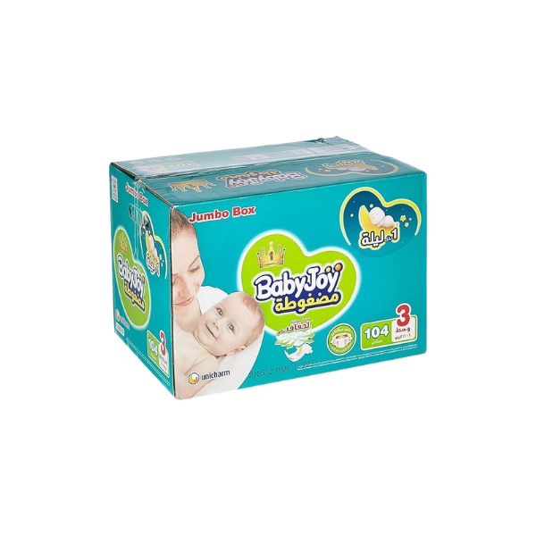 BabyJoy Compressed Diamond Pad Diaper, Size 3, Medium, 6-12 Kg, Jumbo Box, 104 Diapers
