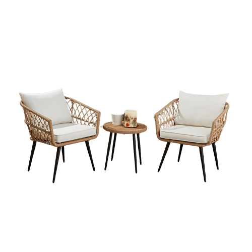 Quality Outdoor Living 65-YZ03HM Hermosa 3 Piece Chat Set, Aluminum Frame + Tan Wicker + Linen Cushions